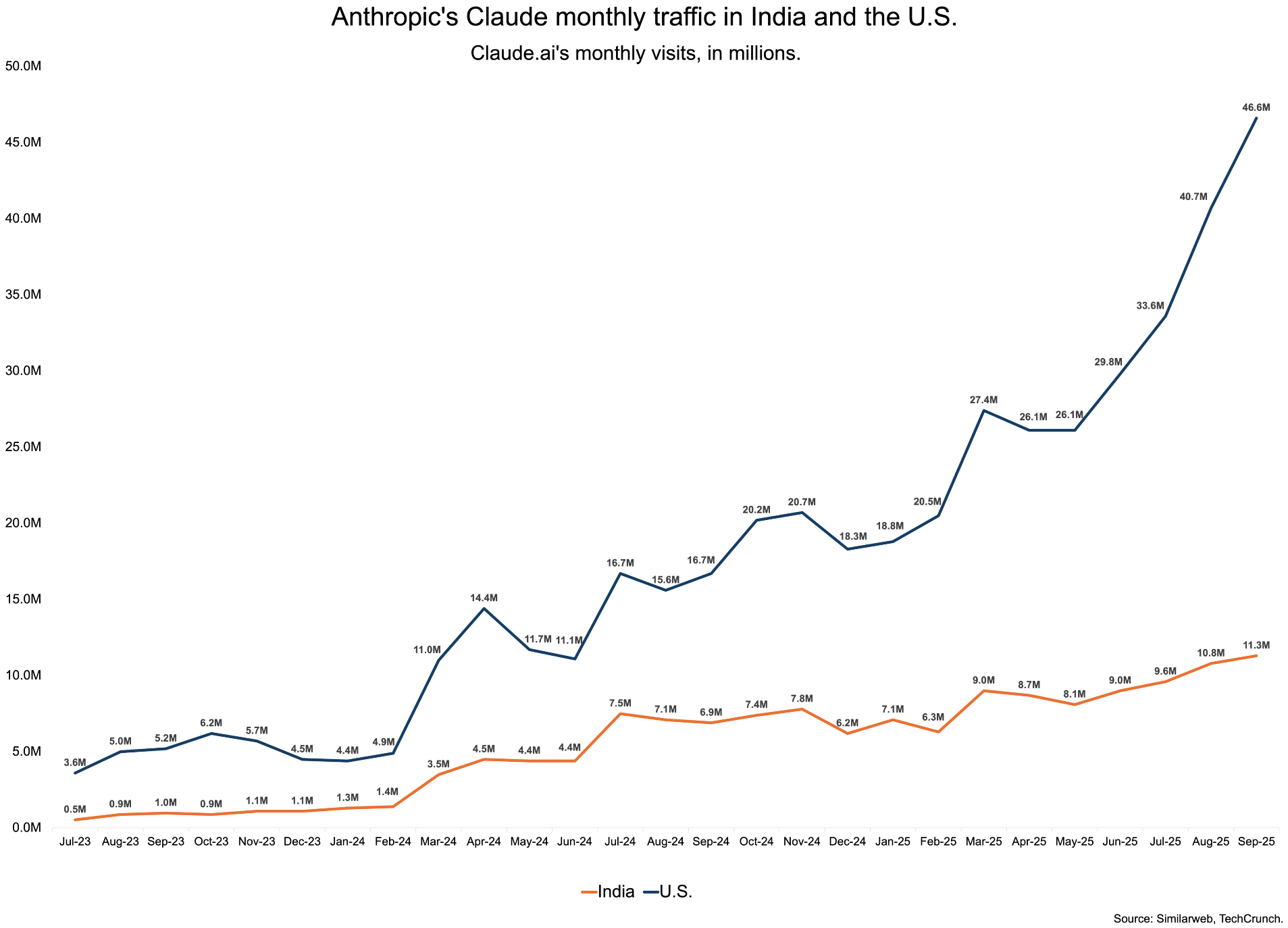 India — the world’s second-largest online market after China, with more than a billion internet subscribers — has emerged as an important growth region for Anthropic. Several Indian AI startups already use its Claude models in their products for both domestic and U.S. clients. India also accounts for the second-highest share of traffic to Claude’s website after the U.S., according to digital intelligence firm Similarweb.