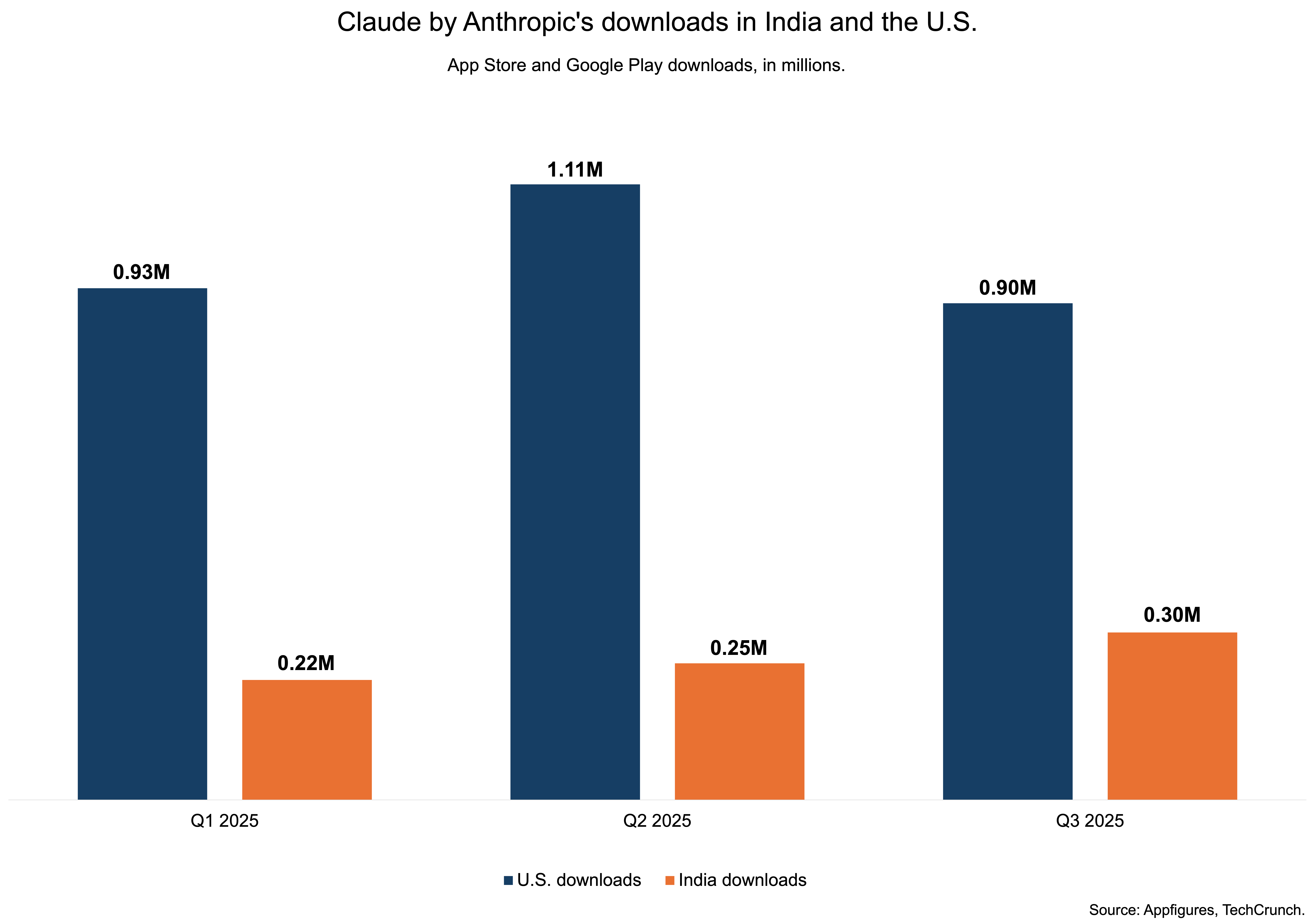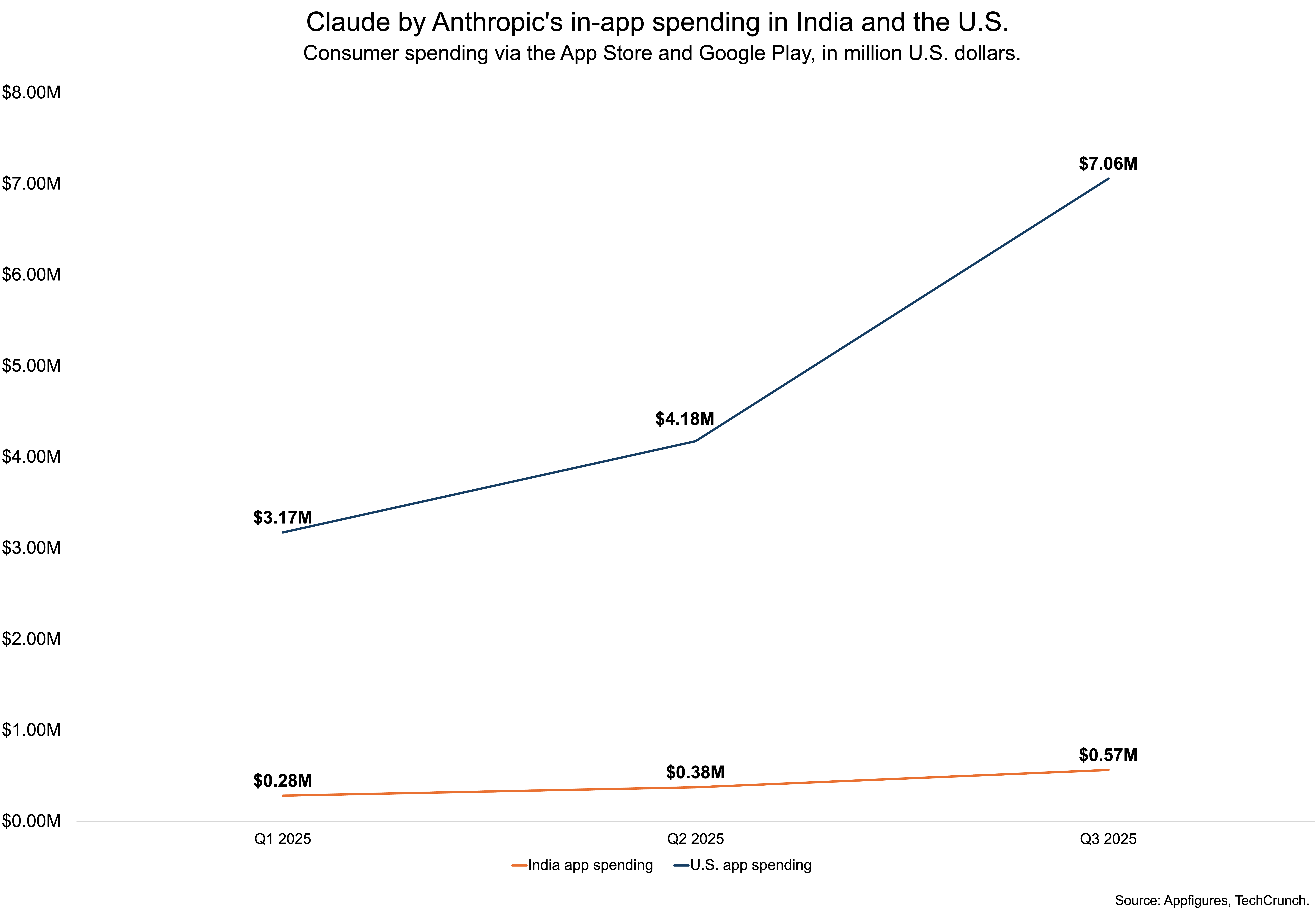 Anthropic’s Claude app, available on iOS and Android, recorded a 48% year-over-year increase in downloads in India in September, reaching about 767,000 installs this year, according to Appfigures. Consumer spending on the app in India surged 572% year-over-year, generating $195,000 in September alone, the data showed.
