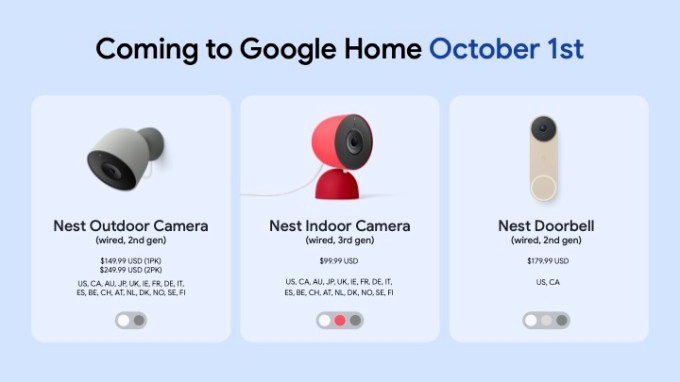 Devices are sold at major retailers and on the Google Store. The Nest cameras are available in the U.S., Canada, Australia, Japan, the U.K., Ireland, France, Germany, Italy, Spain, Belgium, Switzerland, Austria, Netherlands, Denmark, Norway, Sweden, and Finland. The new Nest Doorbell will be available in the U.S. and Canada.